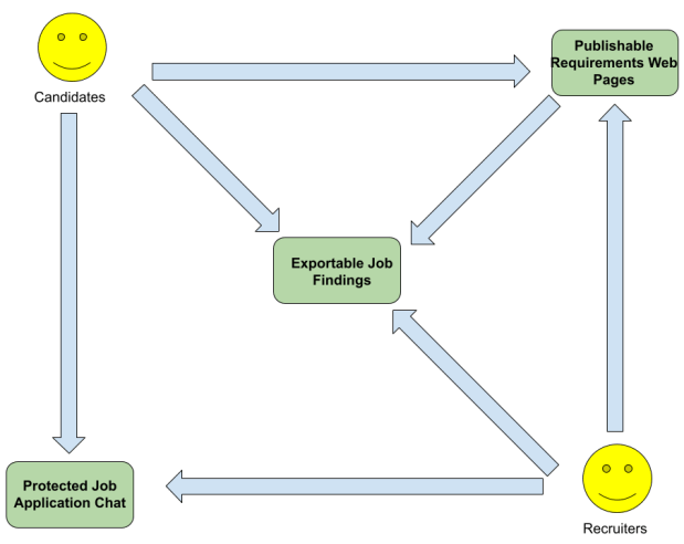 The resulting components will be called Publishable Requirements Web Pages with the same text tagging, saving, and exporting features features, and the ability for creators to start with drafts and publish them when desired. These will be accomplished with making them high-quality HTML documents, partly for the public search feature mentioned below. Also, both will have user- or organization-editable standards to show in the UIs so certain standards will not be forgotten. For candidates, these standards might include best practices in their domain, and for recruiters this might be business standards or metrics, and the fact that keywords used by your ATS should be included in the job listing. On this standards display, eventually some technological automation will also be added to suggest requirements from the users’ past documents and perhaps other public documents on the web.